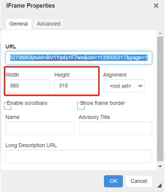 5.双击红色的“IFRAME”,并如图所示填写视频尺寸(请务必按下图数值填写),点击“确定”,即可完成视频嵌入。
