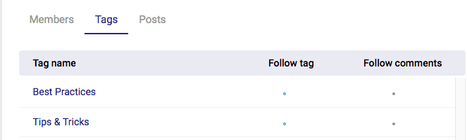 在这个页面的底部,你可以在三个标签中看到并定制你的订阅--每个标签都显示你所关注的成员、标签和帖子。例如,下面的截图显示,用户正在关注一些标签和DC成员。