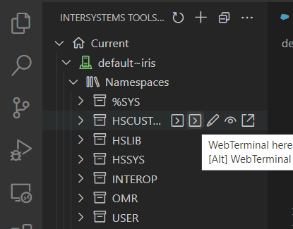 要打开 WebSocket 终端,请单击: InterSystems Tools > 选择一个名称空间 > 单击 Web 终端旁边的图标。