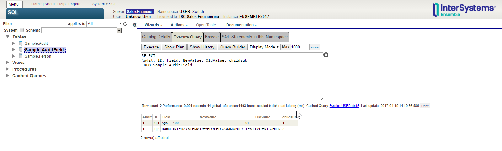 注意Sample.AuditField记录通过Audit字段=1对Sample.Audit类进行了引用。你可以通过使用两个类的关系来查询数据,如下所示: