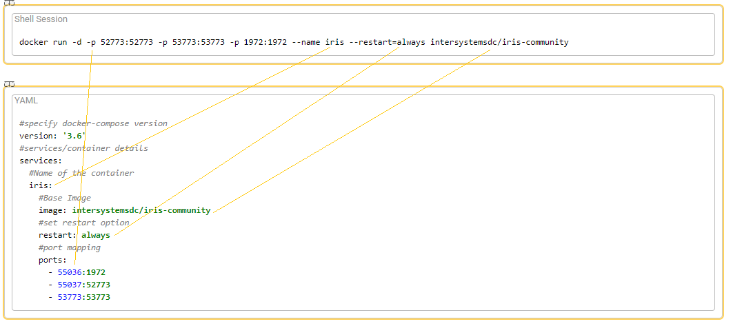 #specify docker-compose version version: '3.6' #services/container details services: #Name of the container iris: #Base Image image: intersystemsdc/iris-community #set restart option restart: always #port mapping ports: - 55036 :1972 - 55037 :52773 - 53773 :53773docker run 命令和 docker-compose 文件的映射如下所示:.png)
