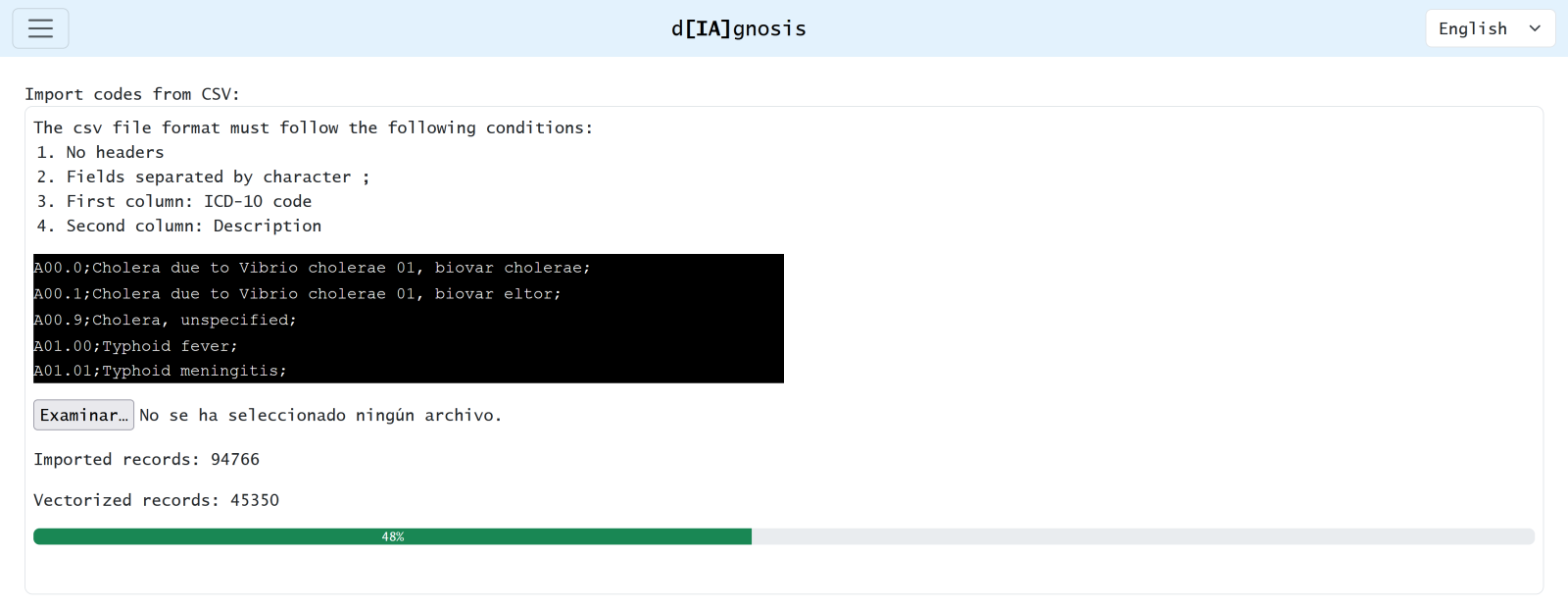 包含 ICD-10 代码的文件位于项目路径 /shared/cie10/icd10.csv 中,达到 100% 后,即可使用该应用程序。
